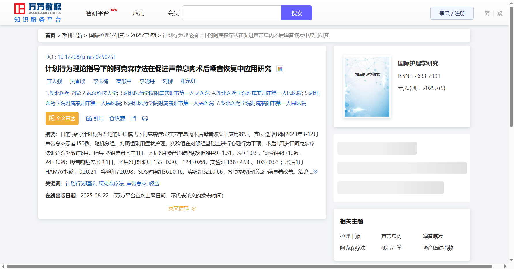 目的 探讨计划行为理论的护理模式下阿克森疗法在声带息肉术后嗓音恢复中应用效果。方法 选取我科2023年3-12月声带息肉患者150例,随机分组。对照组采用症状护理。实验组在对照组基础上进行心理行为干预,术后1周进行..