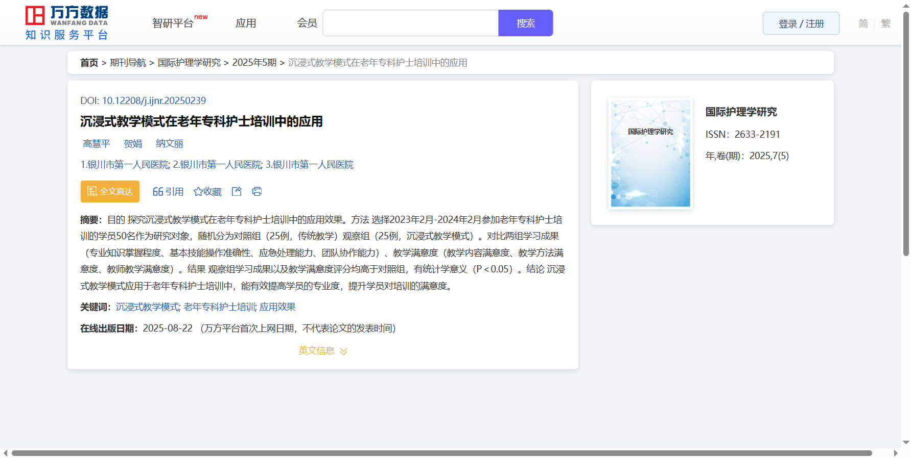 目的 探究沉浸式教学模式在老年专科护士培训中的应用效果。方法 选择2023年2月-2024年2月参加老年专科护士培训的学员50名作为研究对象,随机分为对照组(25例,传统教学)观察组(25例,沉浸式教学模式)。对比两组..