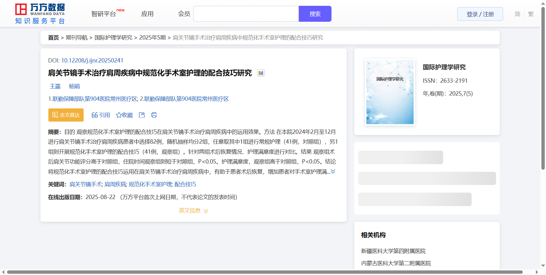 目的 观察规范化手术室护理的配合技巧在肩关节镜手术治疗肩周疾病中的运用效果。方法 在本院2024年2月至12月进行肩关节镜手术治疗肩周疾病患者中选择82例,随机抽样均分2组,任意取其中1组进行常规护理(41例,对照..
