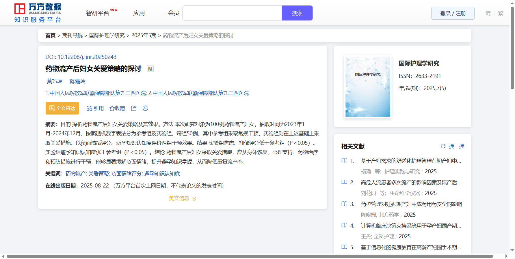 目的 探析药物流产后妇女关爱策略及其效果。方法 本次研究对象为100例药物流产妇女,抽取时间为2023年1月-2024年12月,按照随机数字表法分为参考组及实验组,每组50例。其中参考组采取常规干预,实验组则在上述基础..