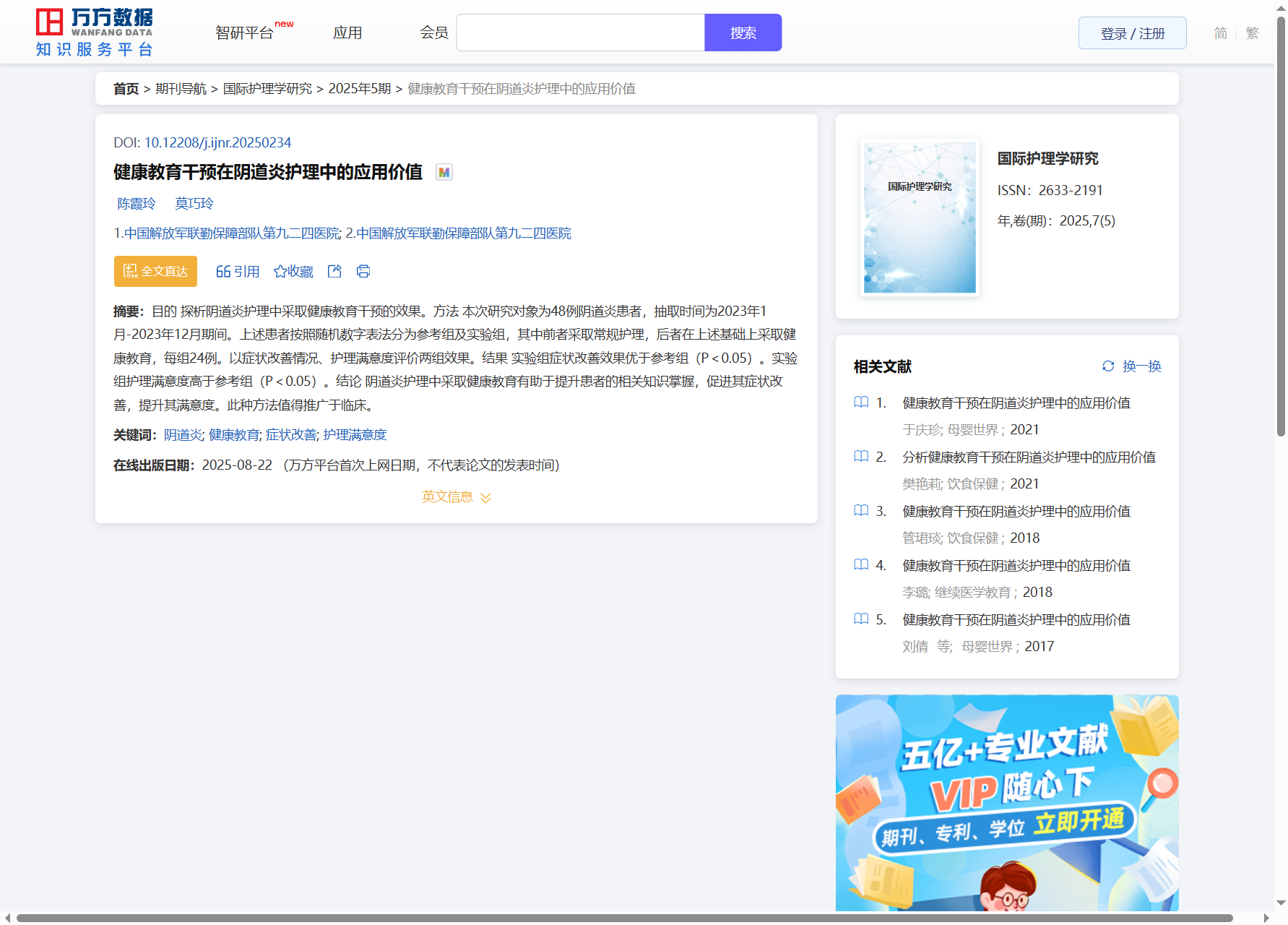 目的 探析阴道炎护理中采取健康教育干预的效果。方法 本次研究对象为48例阴道炎患者,抽取时间为2023年1月-2023年12月期间。上述患者按照随机数字表法分为参考组及实验组,其中前者采取常规护理,后者在上述基础上采..
